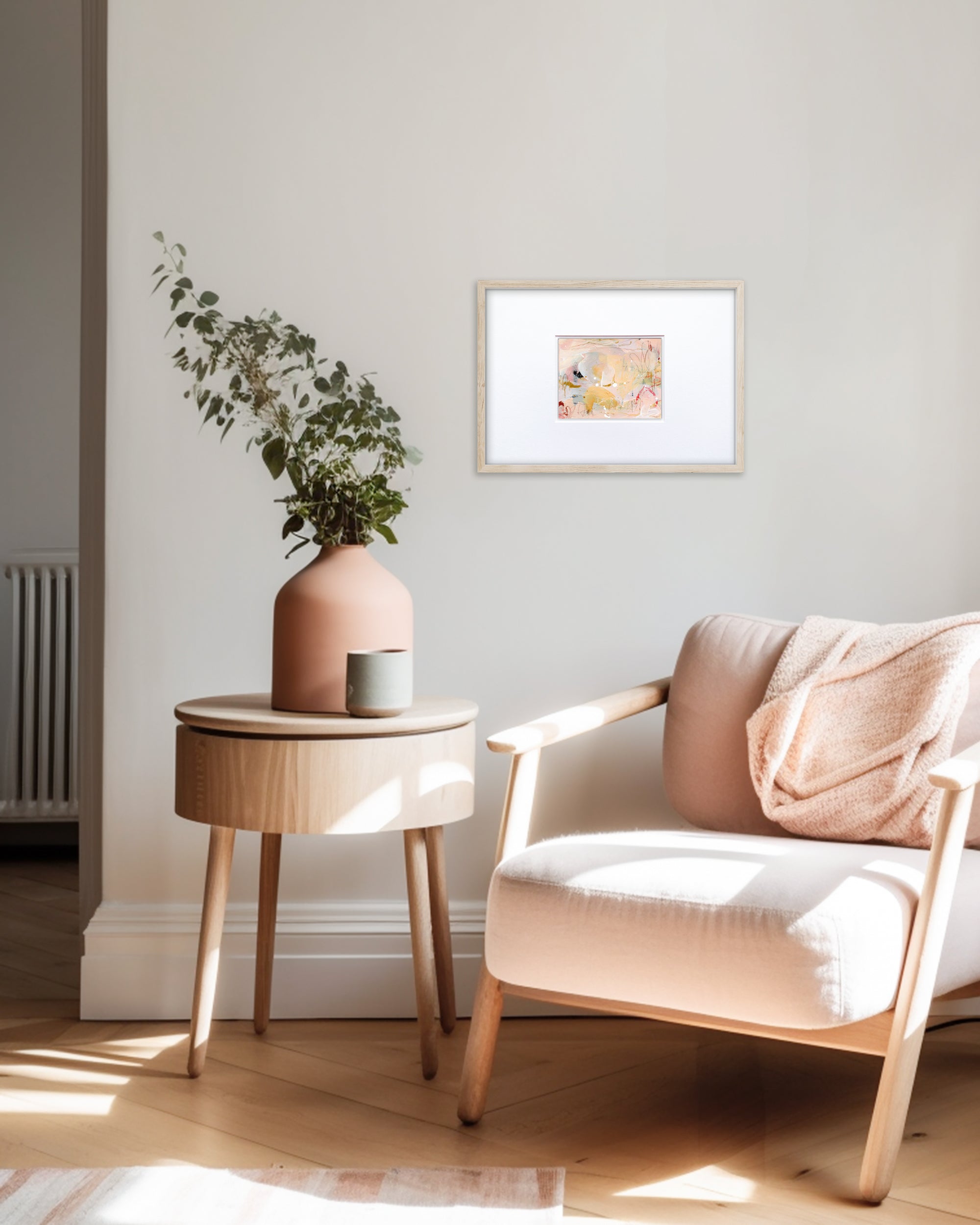 18cm x 13cm Acrylic and soft pastel painting on heavy watercolour paper. Add £35 for additional Glass fronted Oak frame as shown, mount included